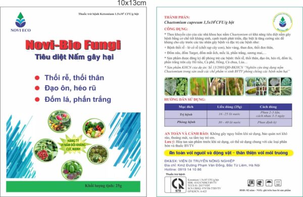 Pha 50g Novi-Bio Fungi + 25ml Novi Eco Siêu Lân cho bình 16-20 lít nước.. Phun 2-3 lần liên tiếp cách nhau 7-15 ngày 1 lần. Phun ướt tán và vùng gốc.