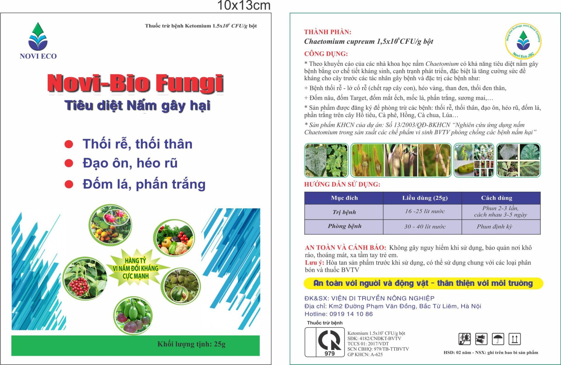 Pha 25g Novi-Bio Fungi + 50ml Novi Eco Siêu Lân cho bình 16-20 lít nước. Phun định kỳ 15-30 ngày 1 lần hoặc sau mỗi lứa thu hoạch.